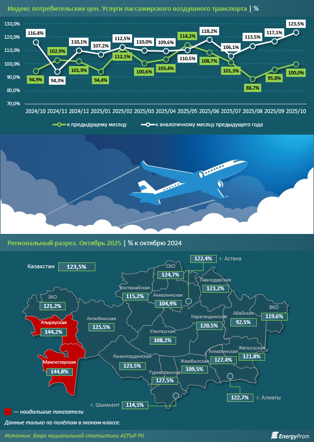 В октябре 2025-го индекс потребительских цен услуги пассажирского транспорта (полёт в эконом-классе) составил 123,5%. Аналогичный скачок цен наблюдался два года назад, в ноябре 2023-го. В течение последних 12 месяцев стоимость перелётов тоже не стояла на месте, однако индекс потребительских цен в секторе варьировался от 107% до 117%. Эти данные приводятся в отчётах информационно-аналитической системы «Талдау» Бюро национальной статистики (БНС) АСПиР РК.