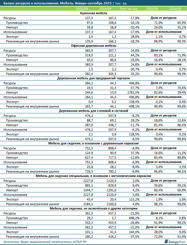 Заметно сократилась доля отечественных фабрик в сегменте деревянной мебели для предприятий торговли. Так, казахстанские мебельщики обеспечили спрос на неё лишь на 7,4% за январь–сентябрь текущего года, против 70,6% за аналогичный период 2024-го. Импорт показал рост сразу в 18,8 раза, до 244,6 тыс. ед., а реализация на внутреннем рынке увеличилась сразу в 6 раз, до 263,7 тыс. ед.