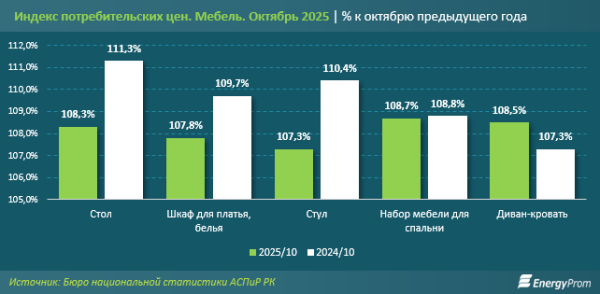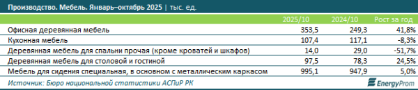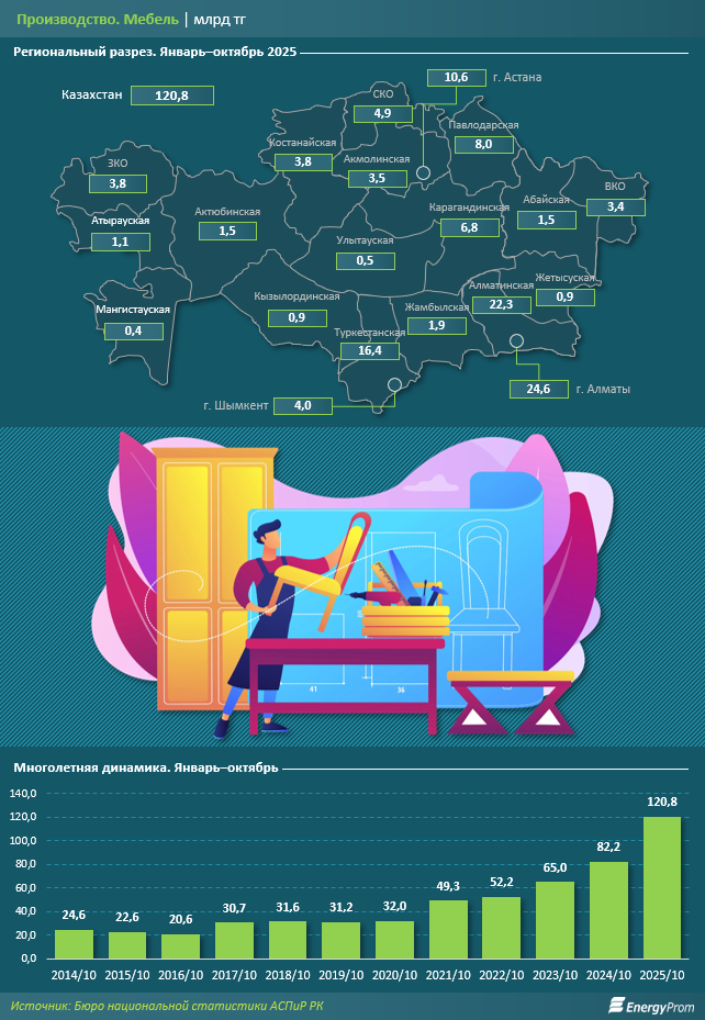 Объём производства мебели в Казахстане за январь–октябрь текущего года составил 120,8 млрд тг — почти в полтора раза больше в деньгах по сравнению с аналогичным периодом 2024-го (более того: выпуск мебели за 10 месяцев текущего года в стоимостном выражении был на 14,6% больше, чем в целом за весь 2024-й).