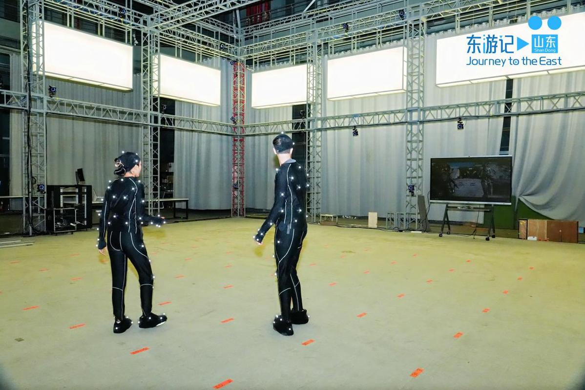 The foreign couple experience motion capture technology at VCAM Stage 5 of China Movie Metropolis, the country's first virtual production platform for film and television, in the West Coast New Area of Qingdao, East China's Shandong province, on Sept 18. [Photo provided to chinadaily.com.cn]