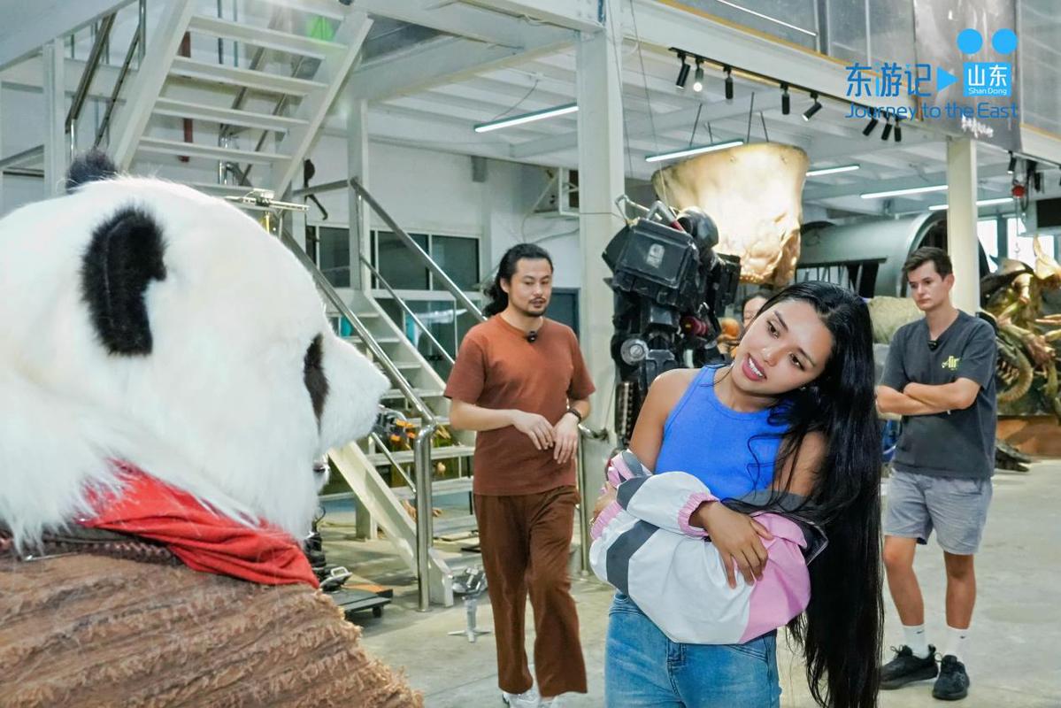The foreign couple interact with a panda prop that mimics human facial expressions at Building 212 of China Movie Metropolis in the West Coast New Area of Qingdao, East China's Shandong province, on Sept 18. [Photo provided to chinadaily.com.cn]