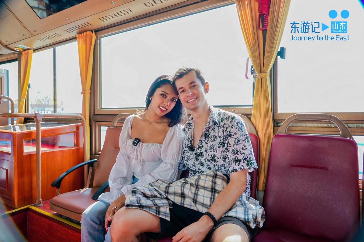 The foreign couple tour the Xilingxia Road on a Dangdang tram in Qingdao, East China's Shandong province, on Sept 20. [Photo provided to chinadaily.com.cn]