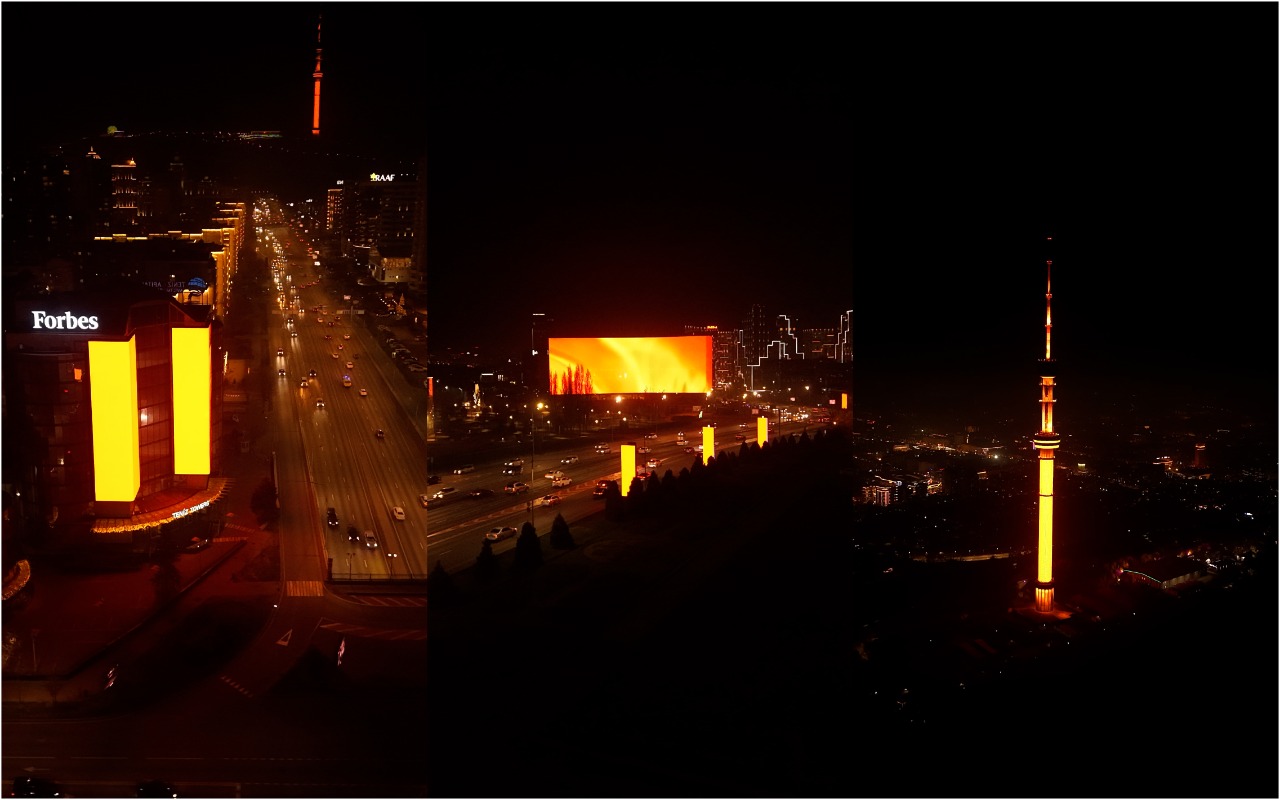 In recent days, the Koktobe TV Tower, Halyk Bank, the First President’s Park, LED screens, and several other city landmarks have been glowing in soft orange hues.