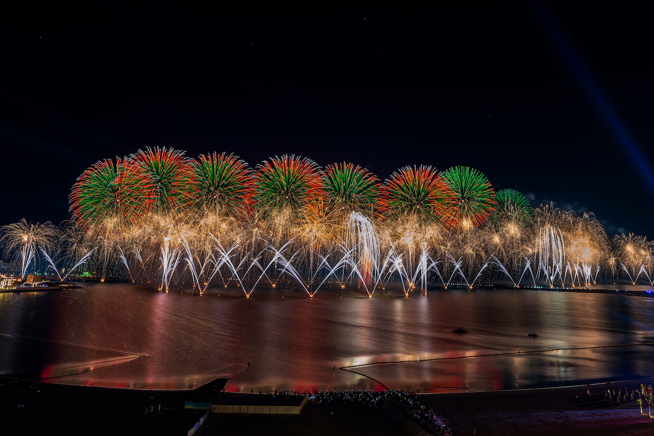 Thousands of residents and visitors watched from beachfront hotels, festival areas, and the Corniche Al Qawasim waterfront, where an earlier show took place.
