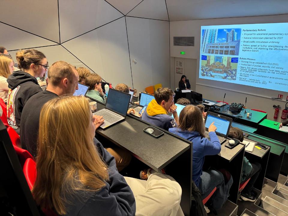 During the lecture, students were introduced to a comprehensive analysis of Kazakhstan’s current position in regional and global affairs. Anel Bakytbekkyzy explained the logic behind the political reforms and the new economic course outlined by President Tokayev, highlighting how these changes are reshaping the country’s governance model and international standing.