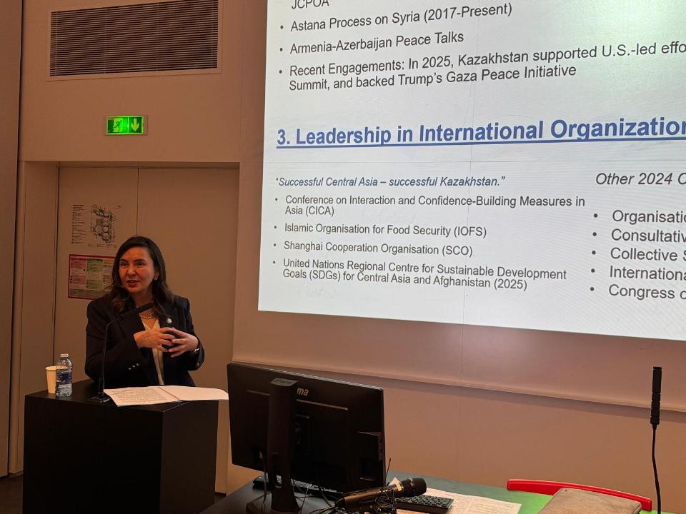 A key part of the lecture focused on Kazakhstan’s multivector foreign policy and its role as a responsible “Middle Power”. The Consul General highlighted the country’s contribution to international security, including: