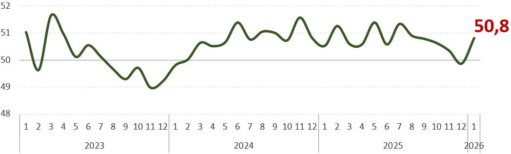 Not all sectors have fully recovered. In construction, the index improved but remained below the neutral threshold at 47.1, up from 45.4 in December. This suggests that while negative trends are easing, the sector continues to face headwinds.