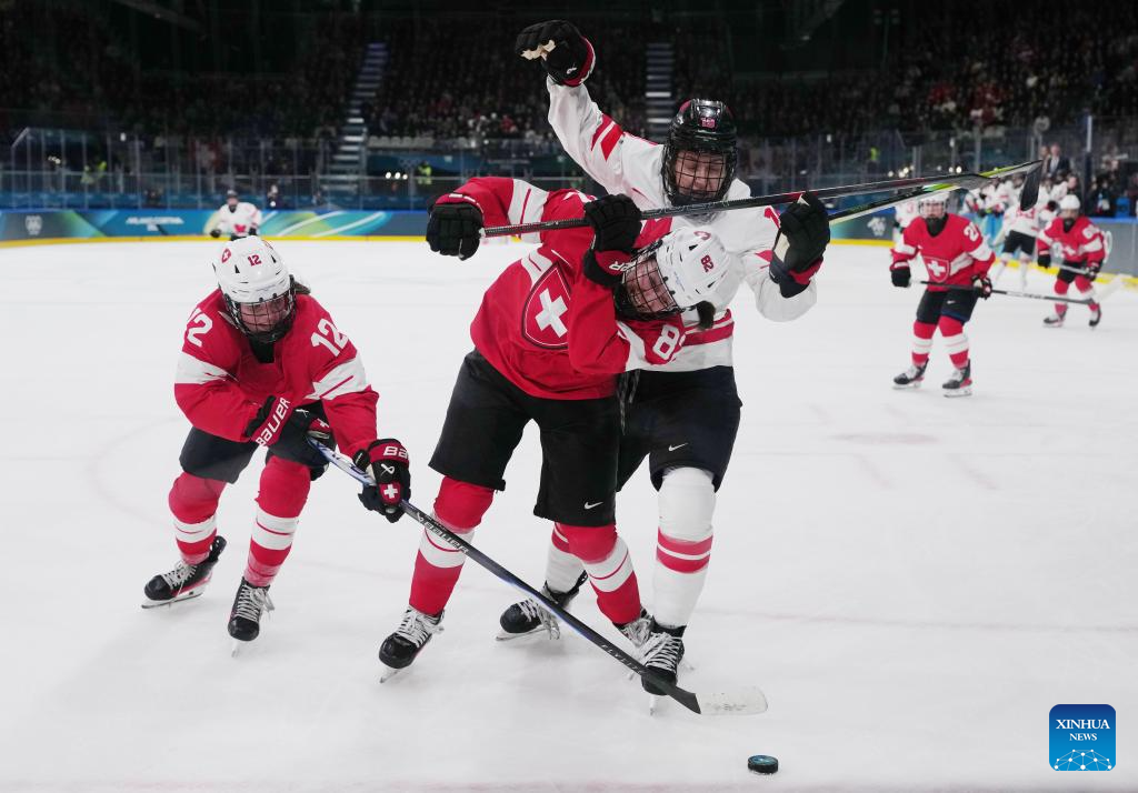 Alessia Baechler (C) of Switzerland vies with Brianne Jenner (R) of Canada during the ice hockey women's preliminary round group A match between Switzerland and Canada at the Milan-Cortina 2026 Olympic Winter Games in Milan, Italy, Feb. 7, 2026. (Xinhua/Tao Xiyi)