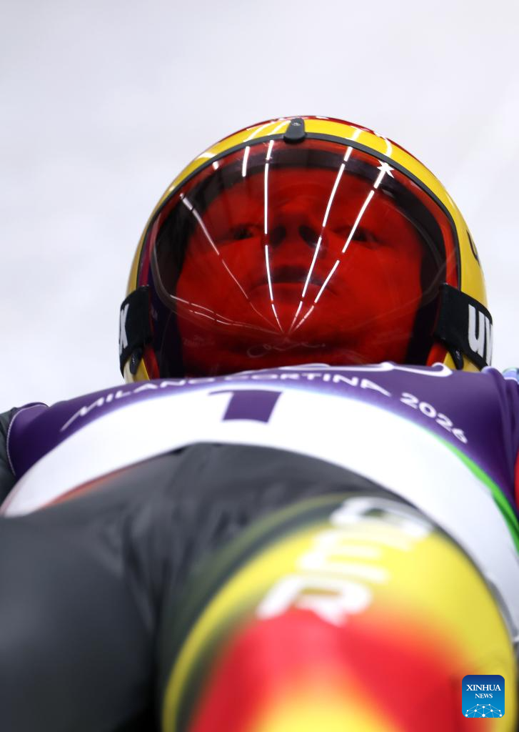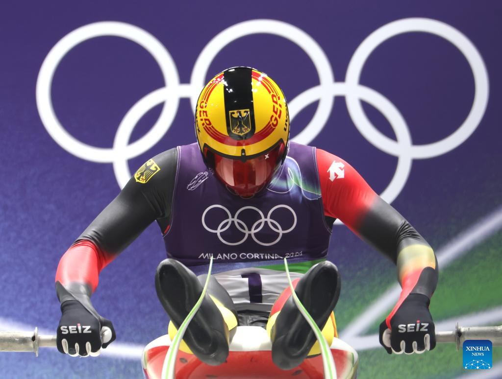 Max Langenhan of Germany competes during the luge men's singles run 1 at the Milan-Cortina 2026 Olympic Winter Games in Cortina, Italy, Feb. 7, 2026. (Xinhua/Ding Xu)