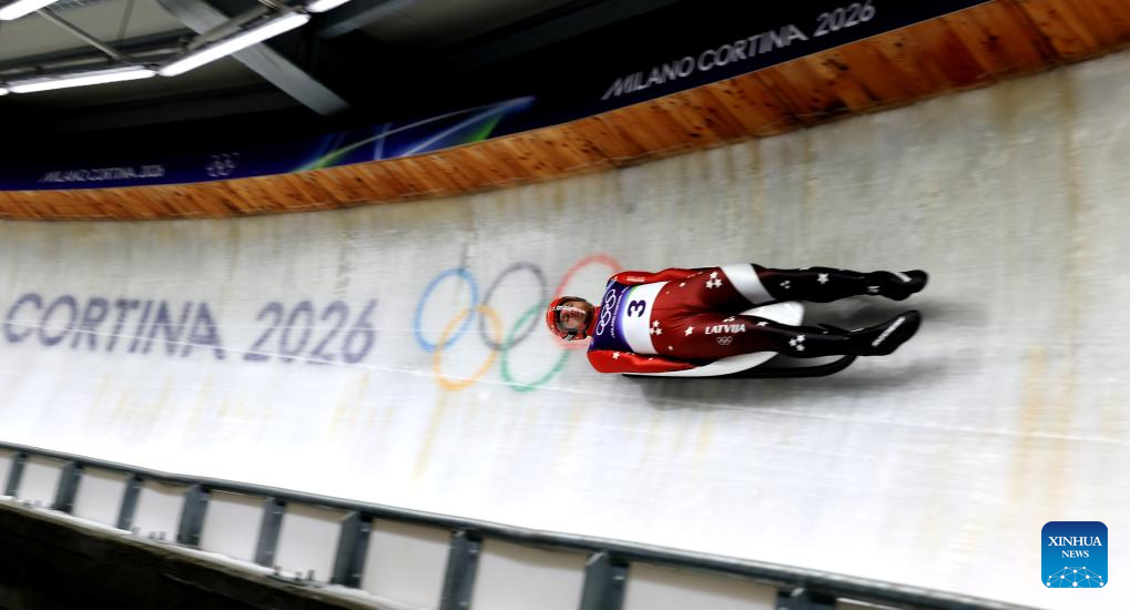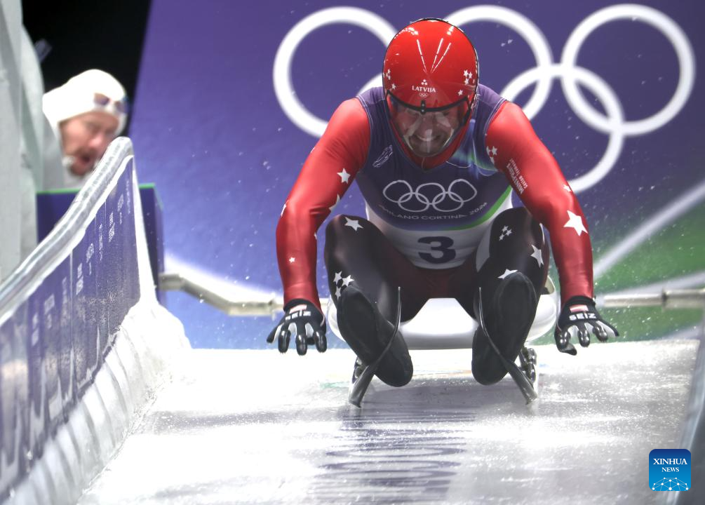 Kristers Aparjods of Latvia competes during the luge men's singles run 2 at the Milan-Cortina 2026 Olympic Winter Games in Cortina, Italy, Feb. 7, 2026. (Xinhua/Ding Xu)