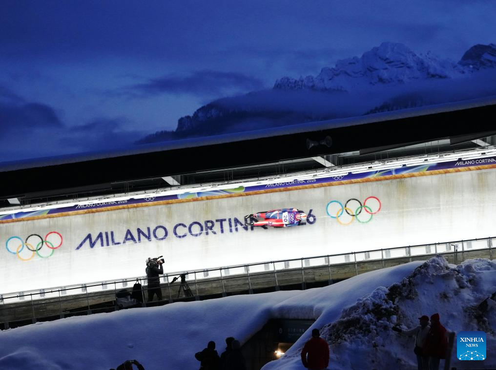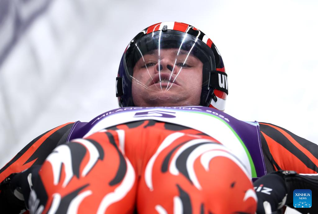 Matthew Greiner of the United States competes during the luge men's singles run 1 at the Milan-Cortina 2026 Olympic Winter Games in Cortina, Italy, Feb. 7, 2026. (Xinhua/Li Gang)