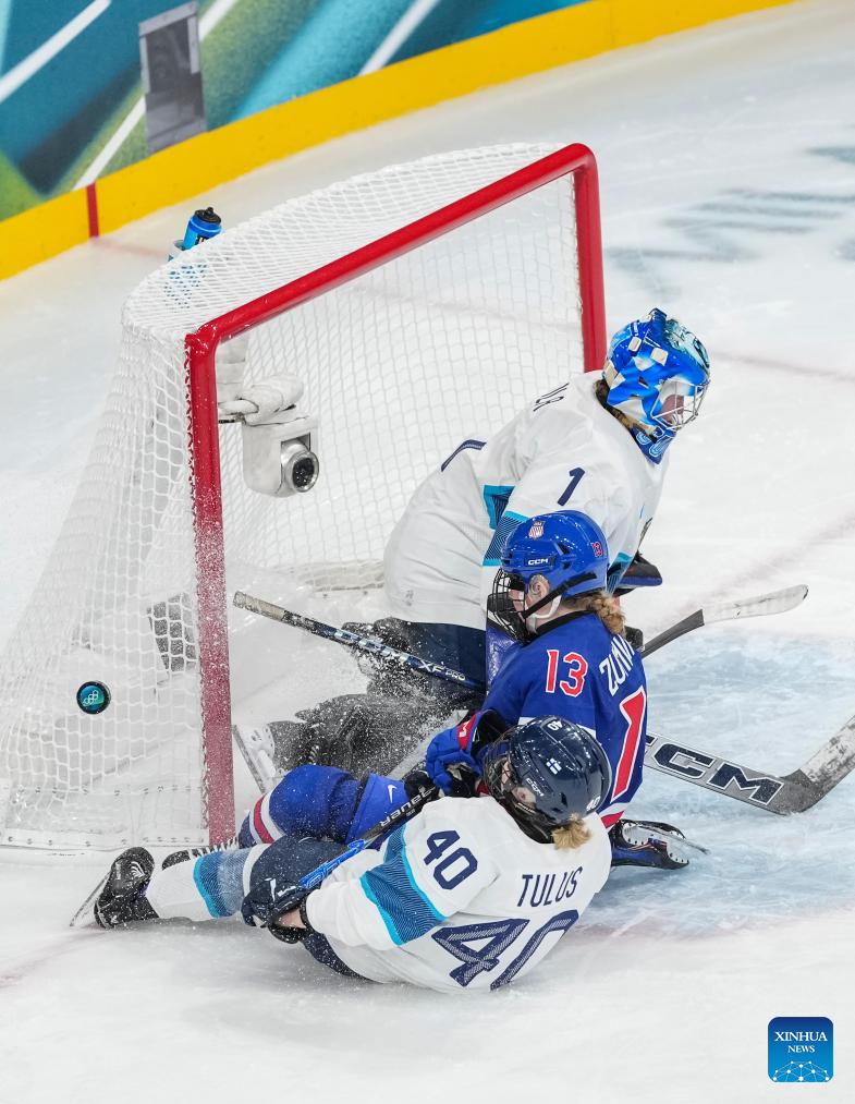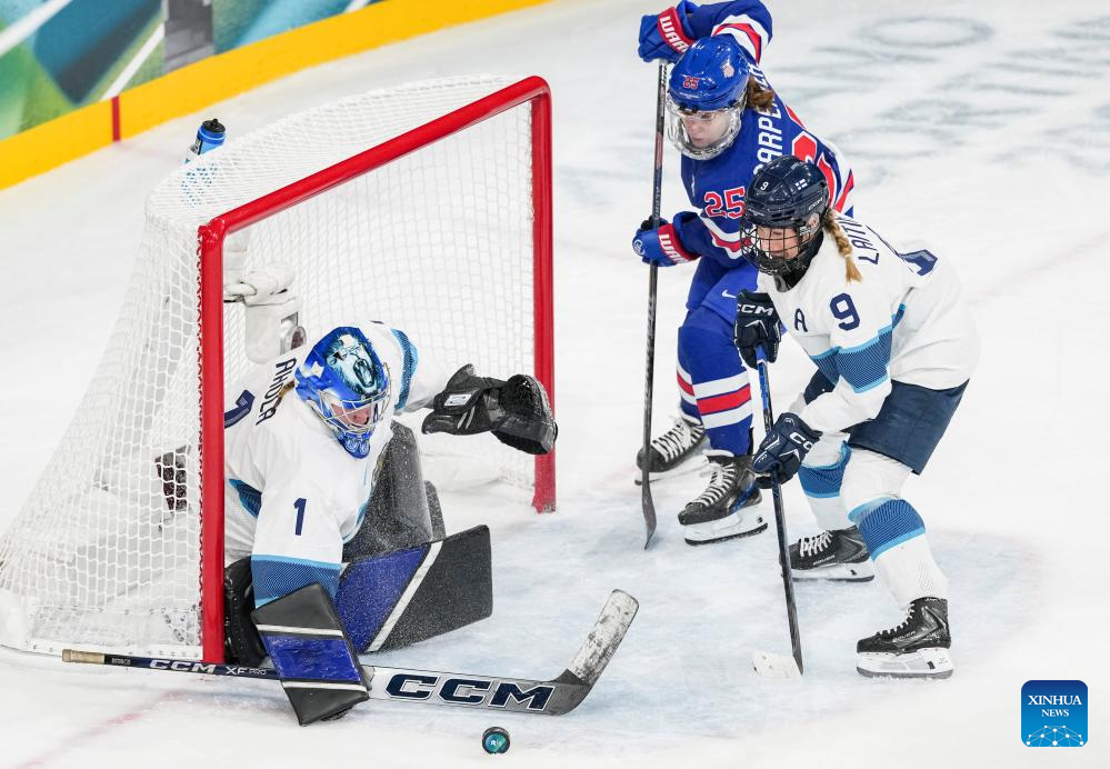 Sanni Ahola (L) of Finland saves a goal during the ice hockey women's preliminary round group A match between the United States and Finland at the Milan-Cortina 2026 Olympic Winter Games in Milan, Italy, Feb. 7, 2026. (Xinhua/Sun Fei)