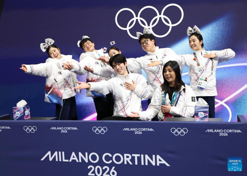 Cha Junhwan (L, front) of South Korea gestures during the short program of men single skating for figure skating team event at the Milan-Cortina 2026 Olympic Winter Games in Milan, Italy, Feb. 7, 2026. (Xinhua/Chen Yichen)