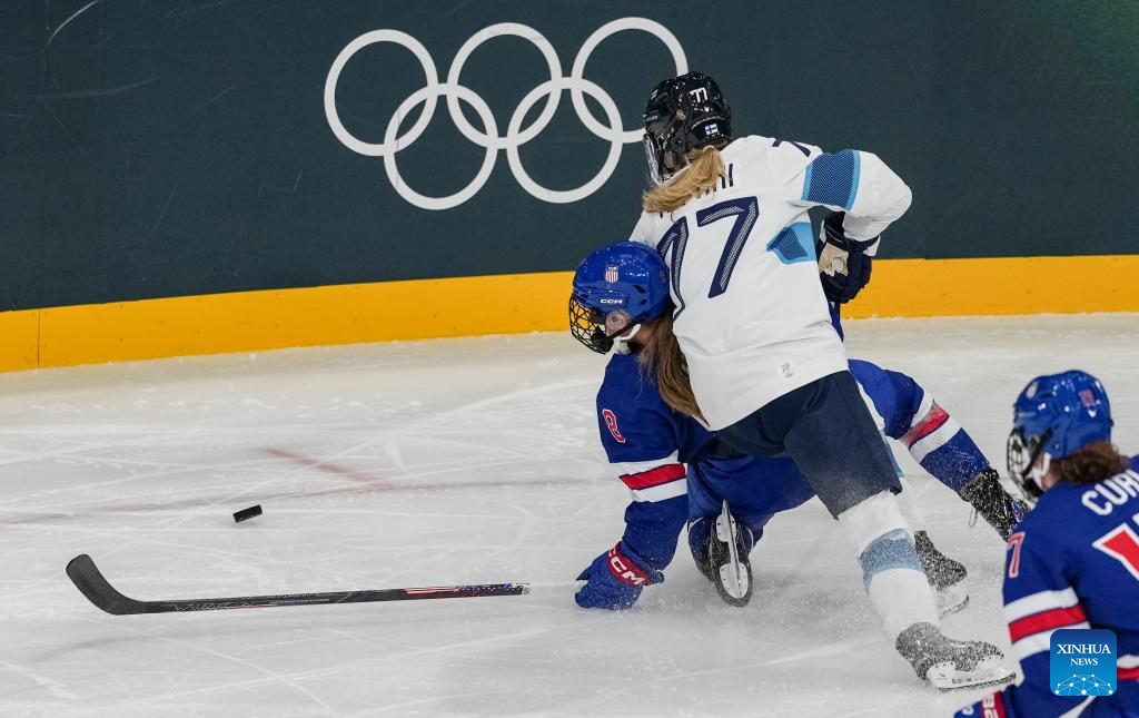 Hayley Scamurra (L) of the United States vies with Viivi Vainikka of Finland during the ice hockey women's preliminary round group A match between the United States and Finland at the Milan-Cortina 2026 Olympic Winter Games in Milan, Italy, Feb. 7, 2026. (Xinhua/Sun Fei)