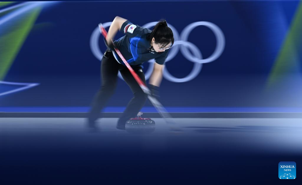 Kim Seonyeong of South Korea competes during the curling mixed doubles round robin session 9 match between South Korea and the United States at the Milan-Cortina 2026 Olympic Winter Games in Cortina D'Ampezzo, Italy, Feb. 7, 2026. (Xinhua/Lian Yi)