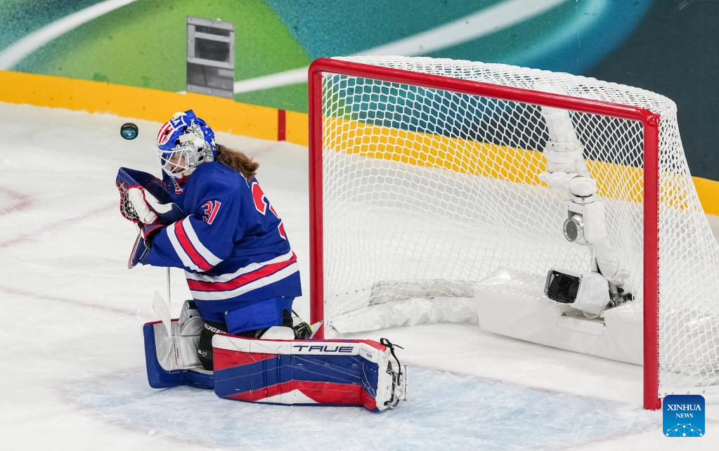 Aerin Frankel of the United States saves a goal during the ice hockey women's preliminary round group A match between the United States and Finland at the Milan-Cortina 2026 Olympic Winter Games in Milan, Italy, Feb. 7, 2026. (Xinhua/Sun Fei)