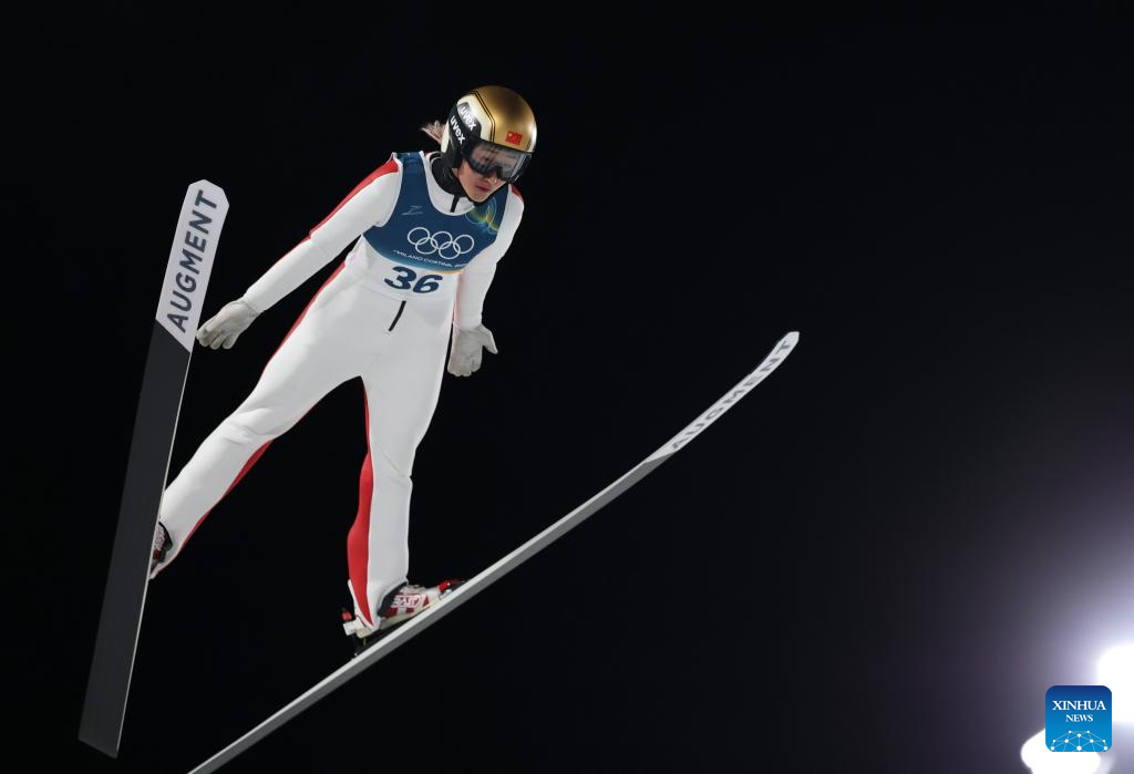 Zeng Ping of China competes during the first round of the ski jumping women's normal hill individual at the Milan-Cortina 2026 Olympic Winter Games in Predazzo, Italy, Feb. 7, 2026. (Xinhua/Huang Wei)