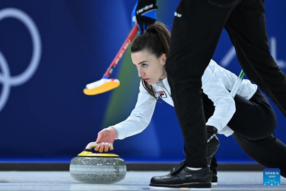 Stefania Constantini of Italy competes during the curling mixed doubles round robin session 9 match between Italy and Norway at the Milan-Cortina 2026 Olympic Winter Games in Cortina D'Ampezzo, Italy, Feb. 7, 2026. (Xinhua/Lian Yi)