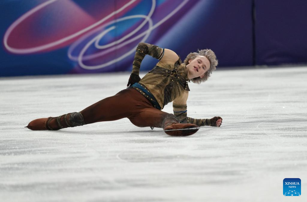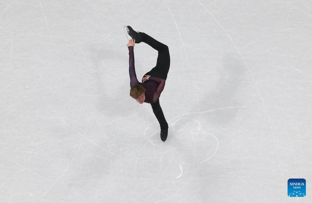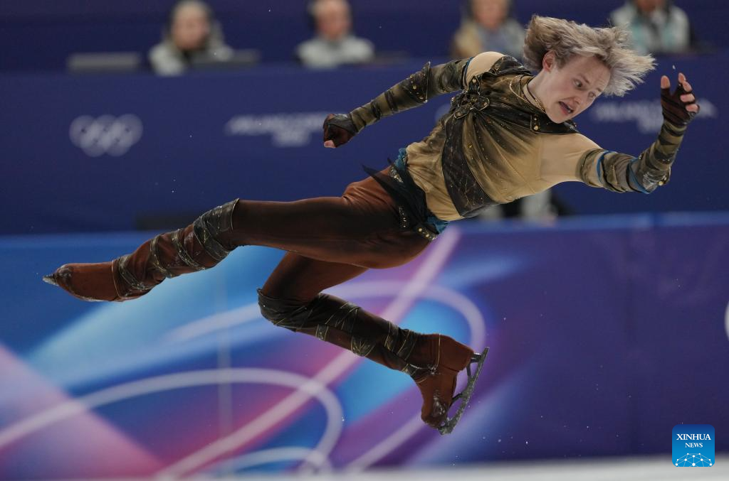 Kevin Aymoz of France competes during the short program of men single skating for figure skating team event at the Milan-Cortina 2026 Olympic Winter Games in Milan, Italy, Feb. 7, 2026. (Xinhua/Li Ming)
