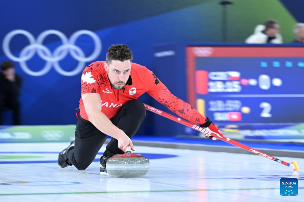Brett Gallant of Canada competes during the curling mixed doubles round robin session 9 match between Estonia and Canada at the Milan-Cortina 2026 Olympic Winter Games in Cortina D'Ampezzo, Italy, Feb. 7, 2026. (Xinhua/Lian Yi)