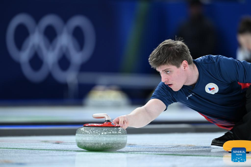 Vit Chabicovsky of the Czech Republic competes during the curling mixed doubles round robin session 9 match between the Czech Republic and Switzerland at the Milan-Cortina 2026 Olympic Winter Games in Cortina D'Ampezzo, Italy, Feb. 7, 2026. (Xinhua/Lian Yi)