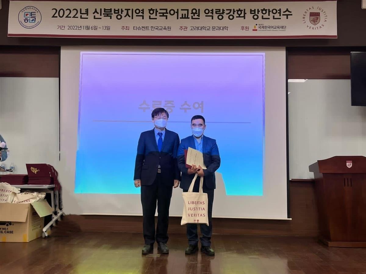Қиыр Шығыс кафедрасының аға оқытушысы Қыдырбаев Бектияр Мырзабайұлы Корея Республикасының Бас консулдығының қолдауымен QS WUR рейтінгі бойынша топ-200 университеттерінің қатарына кіретін Корё университетінде біліктілікті арттыру курстарынан өтті. 2022 жылдың 6 қарашасы мен 13 қарашасы аралығында Бектияр Мырзабайұлы Орталық Азия елдерінің басқа оқытушыларымен бірге университеттің жетекші профессорларының корей тілін заманауи оқыту әдістемелері тақырыбында дәрістерін тыңдап, университеттің орта және жоғары сынып мектептерінде болды. Орталық Азия елдеріндегі корейтану ғылымының өзекті мәселелері бойынша түрлі пікірталастарға қатысты. Бүгінгі таңда бұл оқу орнында қазақстандық студенттер де білім алуда. Қазақстан оқытушылары мен студенттерін шақырып, қолдау көрсеткені үшін Корея Республикасының Бас консулдығына, Алматы қаласындағы Корей білім беру орталығы мен Корё университетіне үлкен алғысымызды білдіреміз және шетелдік серіктес университеттермен алдағы уақытта да жемісті ынтымақтастыққа үміттенеміз.