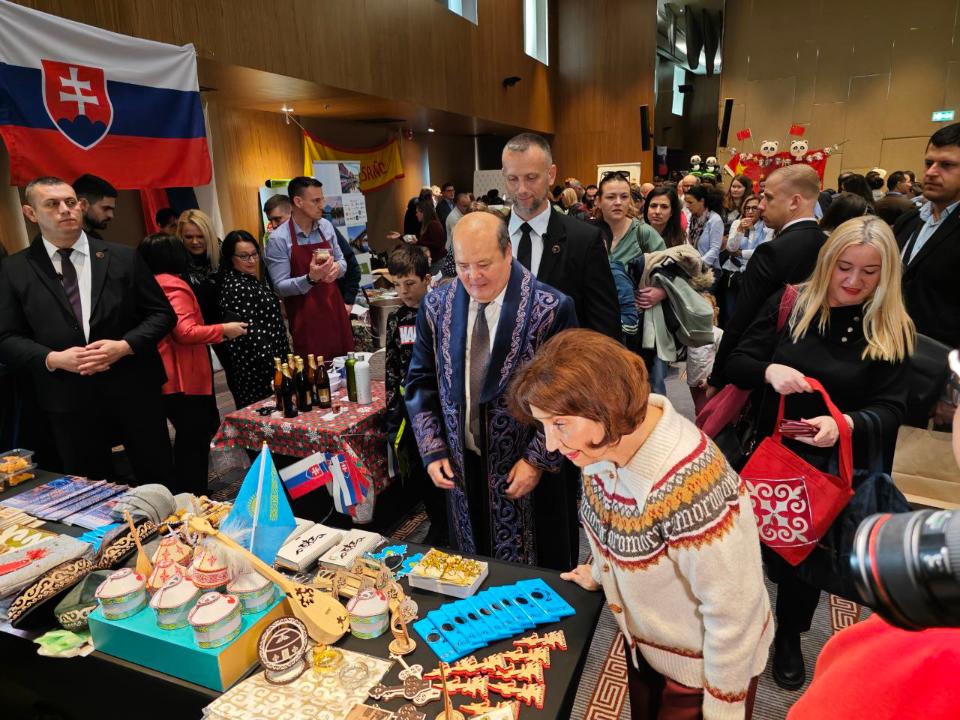 Дәстүр бойынша жәрмеңкеде Солтүстік Македония Президенті Гордана Силяновска-Давкова түрлі елдердің мәдени алуандығымен танысты. ҚР Елшілігінің стендінде мемлекет басшысы ұлттық мәдениет бұйымдарына деген терең қызығушылығын білдірді. Қазақстанның Солтүстік Македониядағы Елшісі Сатыбалды Бұршақов ел басшысына мемлекетіміздің өнері және бай мәдени-тарихи мұрасы туралы ақпарат берді.