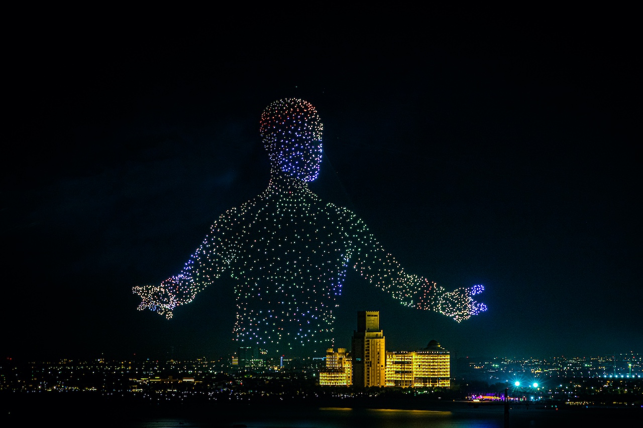 Түнгі аспан тірі кенепке айналды: 2 300 дрон - оның ішінде 1 000 пиродрон - алып феникс бейнесін құрады. Қанаттары жанып, теңіз үстінен көтеріле бергендей әсер қалдырды. Бұл оптимизм мен жаңарудың белгісі болды.