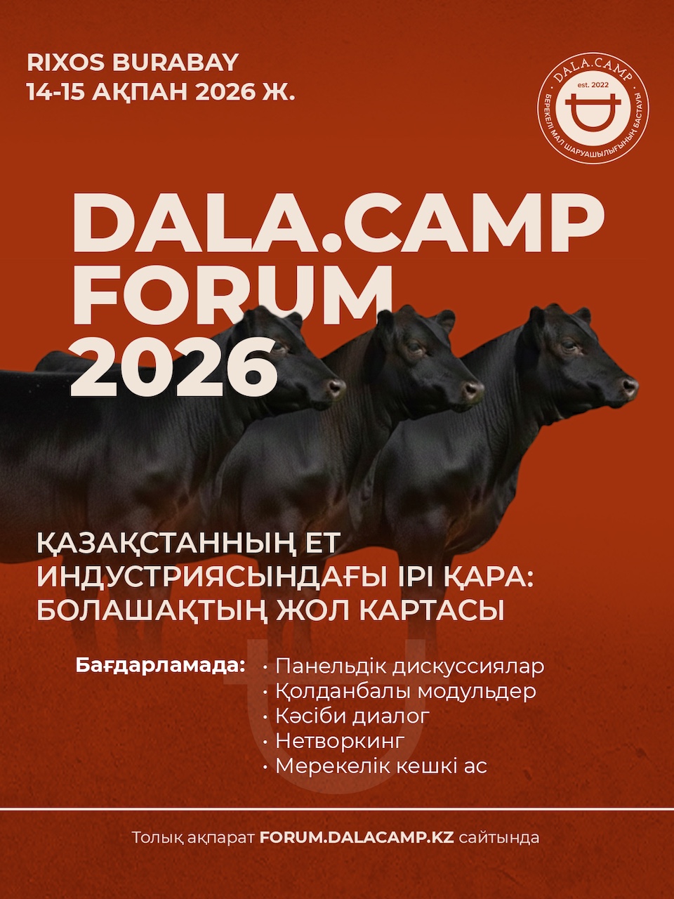 Осы мәселелер 2026 жылғы 14–15 ақпанда Rixos Burabay-да өтетін Dala.Camp Forum алаңында талқыланбақ. Форум «Қазақстанның ет индустриясындағы ірі қара: болашақтың жол картасы» тақырыбымен өтеді.