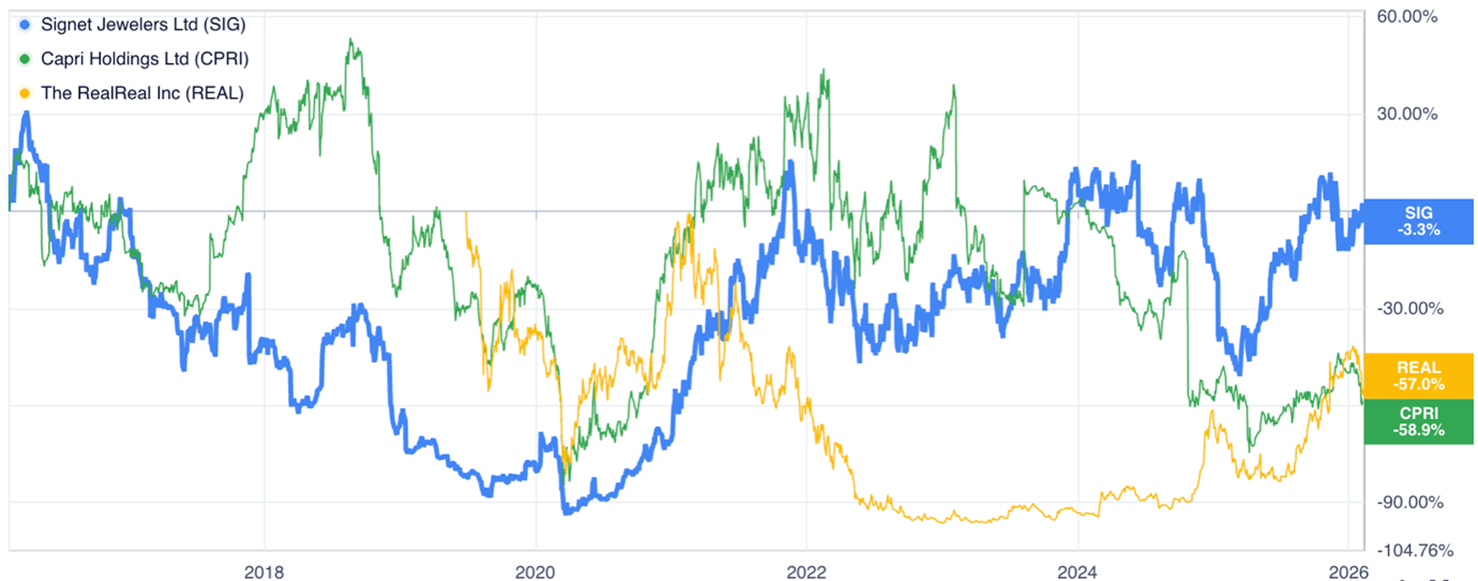 Осы сегменттегі ірі ойыншылардың бірі - Signet Jewelers Limited. Kay, Zales, Jared брендтерін біріктіретін компания жаппай нарыққа бағытталған. Яғни, нақты күндер мен оқиғаларға байланысты сатып алуларға сүйенеді.