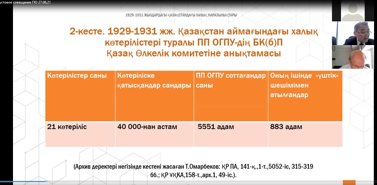 - Қазақ өлкелік комитетінің төрағасы Филипп Голощекиннің Сталинге жазған хатында 1931 жылдың соңында Қазақстан аумағында 34 мың адам қатысқан 15 ірі көтеріліс орын алғаны атап өтілген, - деді баяндамашы. - Нақтыланған мәліметтер бойынша, мен 21 көтерілісті ірі көтерілістер санатына жатқыздым, оған қырық мыңнан астам шаруа қатысты. Көтерілісшілер қатарынан 5551 адам ОГПУ өкілетті өкілдерінің шешімімен сотталып, 883 адам ОГПУ-дың "троек" және "двоек" қаулыларымен атылды.