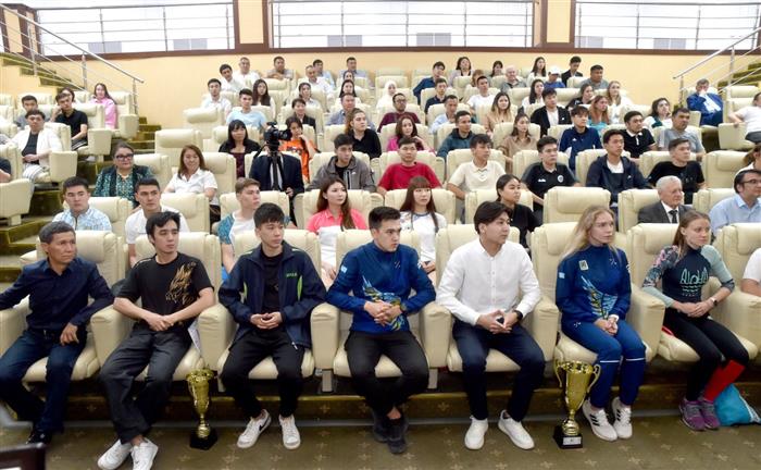 Салтанатты шарада ректор Жансейіт Түймебаев жеңімпаздар мен жаттықтырушыларды ХІІ жазғы универсиадада үздік өнер көрсеткені үшін Алғыс хатпен марапаттады.
