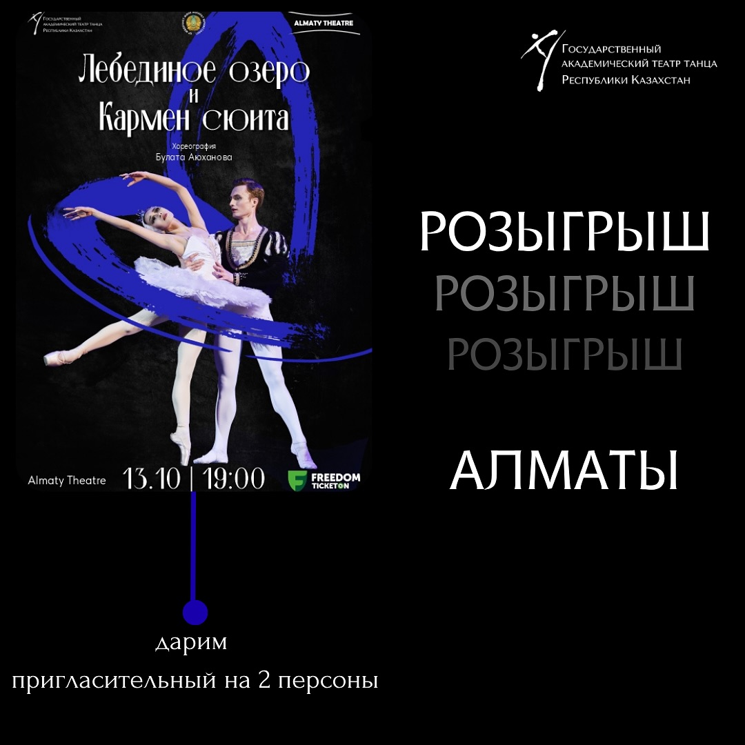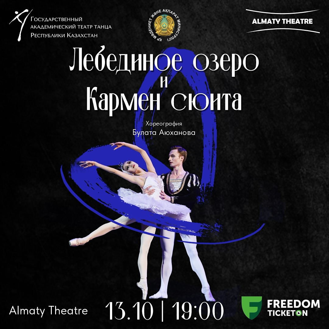 13 қазан күні сағат 18:00-де Almaty Theatre үлкен сахнасында Қазақстан Республикасының Мемлекеттік академиялық би театры көрерменге әлемдік балет классиканың жауһарларын ұсынады. Ол – Болат Аюхановтың авторлық нұсқасындағы аңызға айналған «Аққу көлі» балеті және Жорж Бизенің экспрессивті «Кармен-сюита» қойылымы.