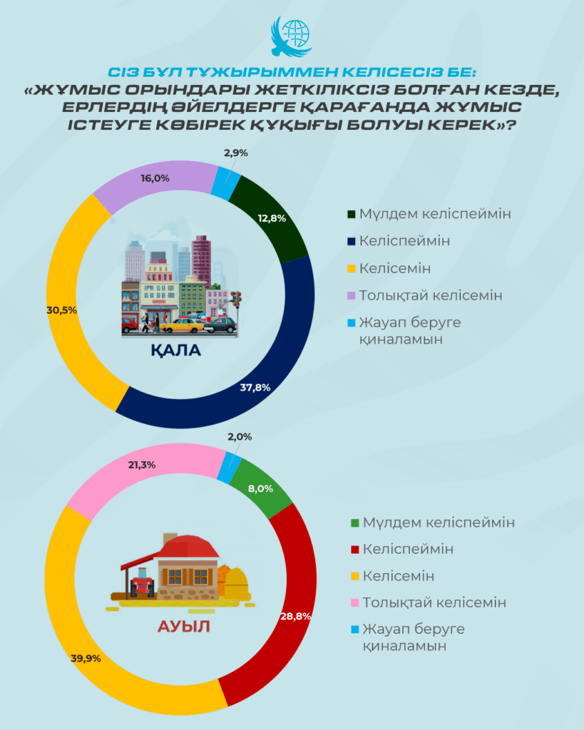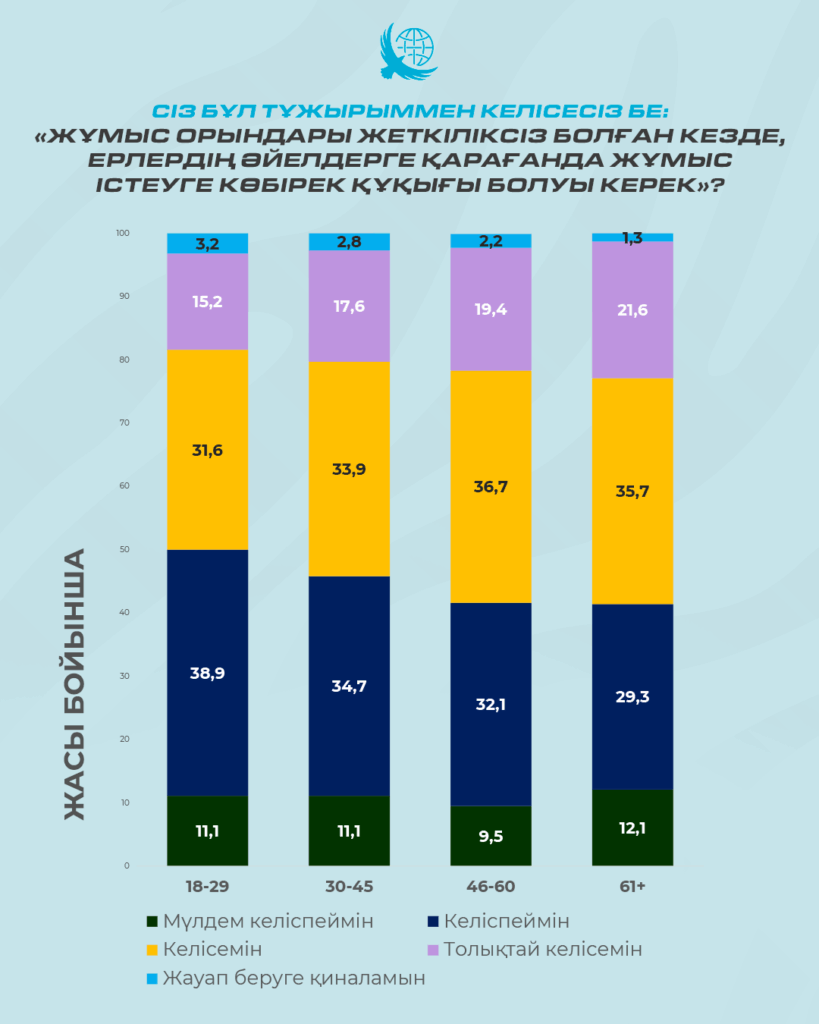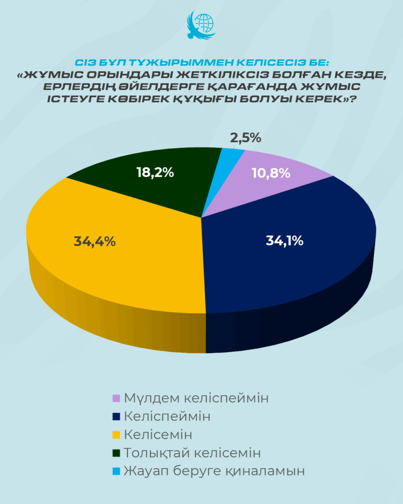 Әлеуметтанулық тұрғыдан алғанда, гендер тек әйелдерді талдаумен шектеуге болмайды – жүйенің екінші жартысын, яғни ерлерді де есепке алу қажет. Сауалнама барысында қатысушыларға: «Жұмыс орындары жеткіліксіз болған жағдайда, ерлердің әйелдерге қарағанда жұмысқа орналасуға көбірек құқығы болуы тиіс» деген пікірге көзқарасын білдіру ұсынылды. Нәтижесінде, респонденттердің 52,5%-ы бұл пікірмен белгілі бір дәрежеде келіссе, 44,9%-ы (сауалнама ҚСЗИ тапсырысы бойынша 11.05-22.06.2024 аралығында 8101 респонденттің қатысуымен өткізілді. Сауалнамаға 18 жастан асқан, елдің 17 өңірі мен республикалық маңызы бар Астана, Алматы және Шымкент қалаларының тұрғындары қатысты) келіспейтінін айтты. Ал ерлердің 55,5%-ы бұл мәлімдемемен келіскен болса, әйелдер арасында бұл көрсеткіш сәл төмен – 50%.