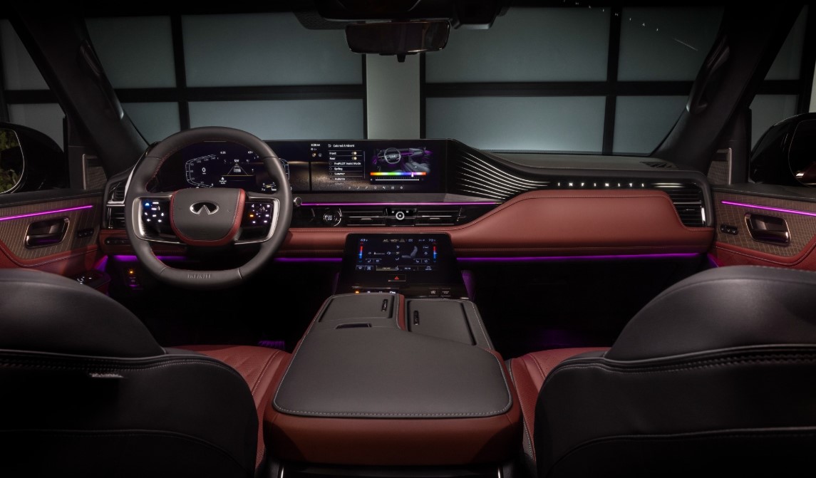 Жаңа QX80 салоны жоғары сапалы материалдар мен ең жаңа технологияларды біріктіреді. Ішкі әрлеуде табиғи ағаш, металл ендірмелер және қолдан тігіліп өңделген жартылай анилинді былғары пайдаланылған. Салонның Ambient lighting деп аталатын жеке баптауға болатын жарық жүйесі маусым ауысымдарынан шабыт алған 64 түрлі жарық реңкін ұсынады. Бұл модельде алғаш рет Google қызметтері — Google Assistant, Google Maps және Google Play орнатылған. Biometric Cooling жүйесі арнайы сенсорлардың көмегімен екінші қатардағы жолаушылар аймағын стандартты салқындату жүйелеріне қарағанда 50% жылдам салқындатады. Қалада жүргізуді жеңілдету үшін Front Wide View және Invisible Hood View жүйелері енгізілген. Олар жүргізушіге көліктің алдындағы және капот астындағы кеңістікті көруге мүмкіндік береді. Klipsch Reference Premiere аудиожүйесінің жоғарғы нұсқасы 24 динамик пен 1200 Вт қуатты қамтиды. Яғни дыбыс сапасы концерт залындағыдай әсер береді.