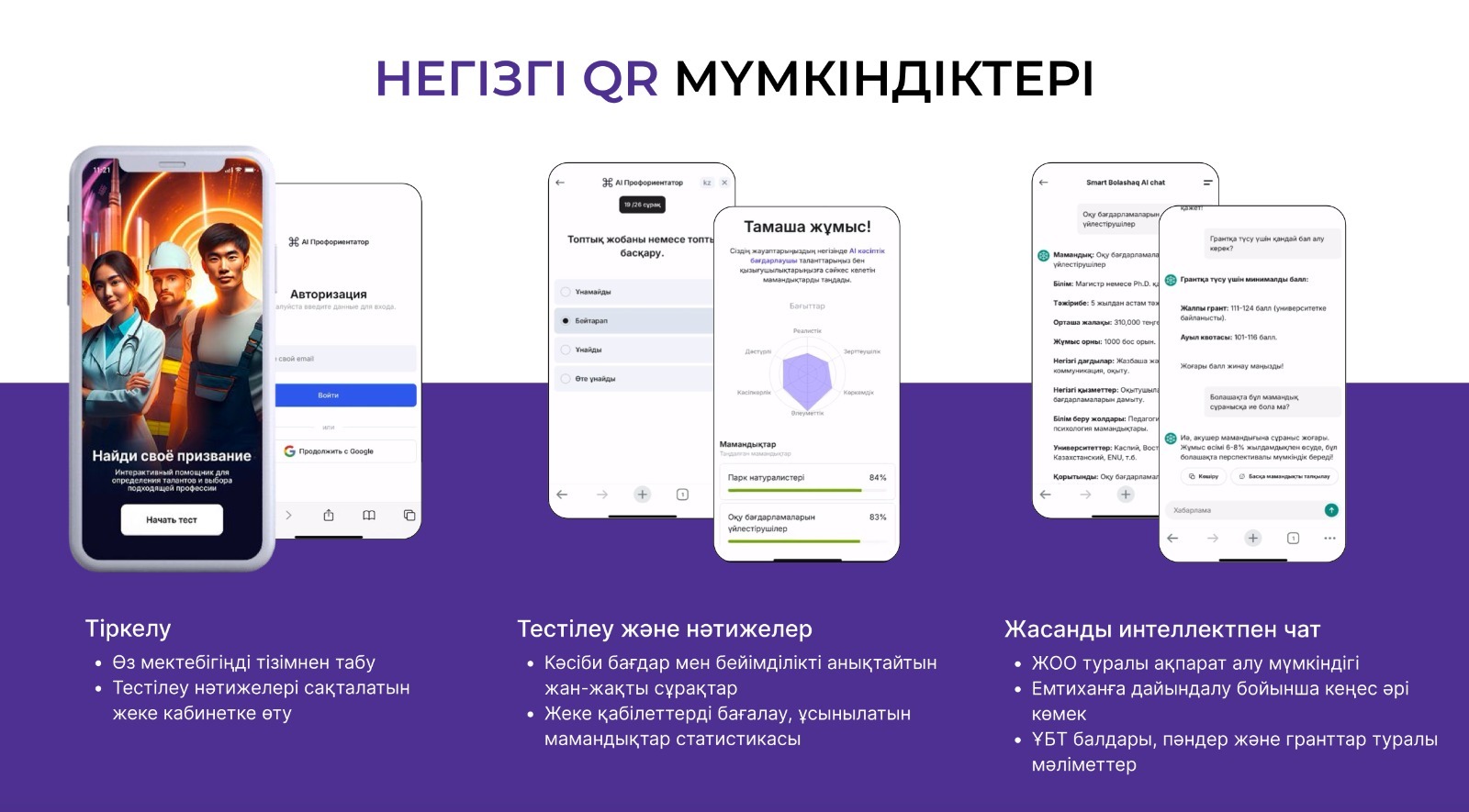 - Жұмыс істеу мүмкіндіктері, қажетті құзыреттер, әлеуетті жалақы деңгейі жәнетиісті бағыттар бойынша жоғары оқу орындарына түсу мүмкіндіктері туралыегжей-тегжейлі ақпарат;