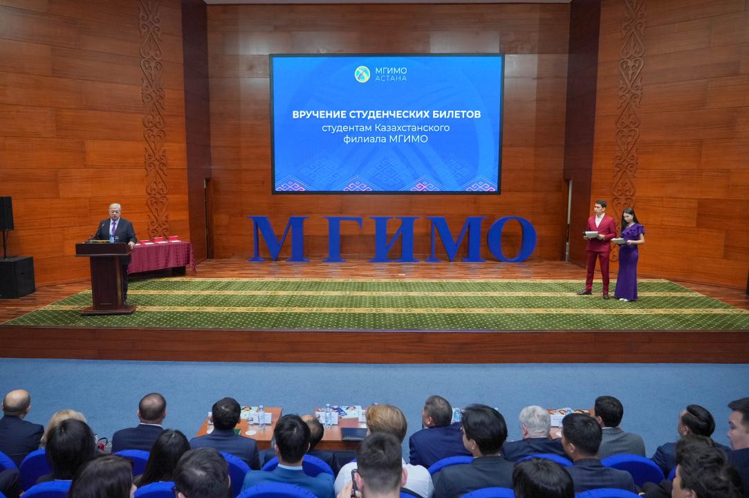Еуразия ұлттық университеті базасындағы Мәскеу мемлекеттік халықаралық қатынастар институтының (ММХҚИ) Қазақстандағы филиалының бакалавриат және магистратура бағдарламаларының алғашқы студенттеріне студенттік билеттерді ҚР Ғылым және жоғары білім министрі Саясат Нұрбек пен ММХҚИ ректоры Анатолий Торкунов табыстады, деп хабарлайды DKNews.kz.