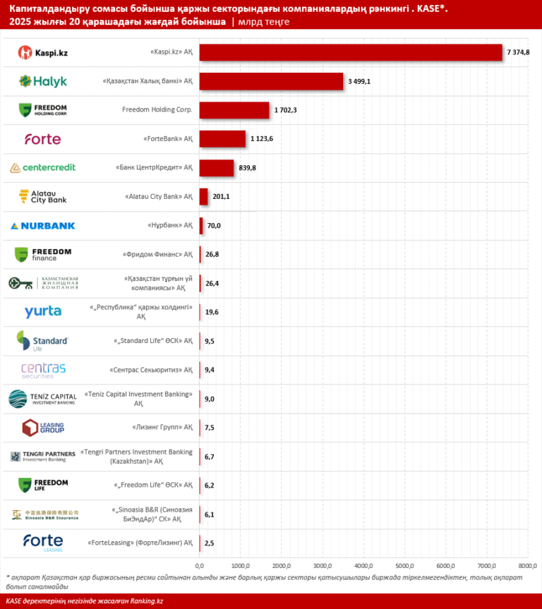 Екінші орынға 3,5 трлн теңге капиталдандыруымен Halyk Bank орналасты. Үздік үштікті 1,7 трлн теңге капиталдандыруымен Freedom Holding Corp. түйіндейді.
