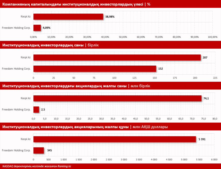 Kaspi.kz капиталындағы институционалдық инвесторлардың үлесі 38,98%-ға жетеді, бұл нарықтағы кәсіби қатысушылардың жоғары қызығушылығын көрсететін маңызды көрсеткіш болып табылады, ал Freedom Holding Corp. компаниясында бұл көрсеткіш небәрі 4,09%-ды құрайды, яғни, институционалдық инвесторлардың қатысуының минималды екенін білдіреді.