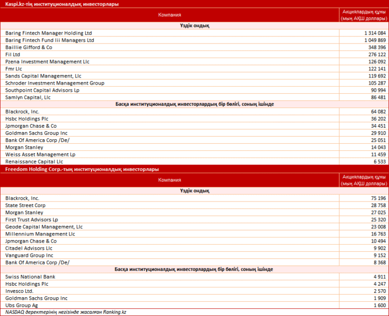 Алайда мынаны айта кеткен жөн, екі компания бойынша институционалдық инвесторлардың жалпы құны арасындағы айтарлықтай айырмашылықты ескере отырып, жеке қатысушылардың салымдарының көлемдерін салыстыру мүмкін емес. Мысалы, Freedom Holding Corp. компаниясында 10 млн АҚШ долларынан астам акцияға тек жеті институционалдық инвестор ие болса, ал Kaspi.kz-те мұндай инвесторлардың саны 59-ға жетеді. Толығырақ ақпарат төмендегі ақпараттық кестеде көрсетілген.