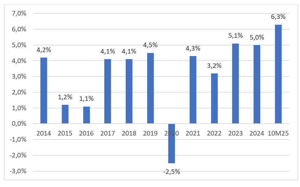 Қазақстанның ІЖӨ-сі өткен жылдары кестеде көрсетілгендей, жылына шамамен 3%-ға өсті. Ал 2023 жылы нақты өсім 5,1%-ды, 2024 жылы - 5%-ды құрады, ал 2025 жылғы 10 айда 6,4%-ға жетті. Бұл көрсеткіштен 2025 жыл ел экономикасы үшін ерекше жыл болғанын көріп отырмыз. Соңғы рет экономиканың өсу қарқыны 2011 жылы өте жоғары болды, ол кезде мұнай бағасының бір бөшке үшін 120 АҚШ долларына дейін қалпына келуі жағдайында 7,5%-ға жетті. Енді мұнай 65 АҚШ доллары ғана тұрады, бірақ экономика айтарлықтай өсті, бұл бірқатар фактормен түсіндіріледі.
