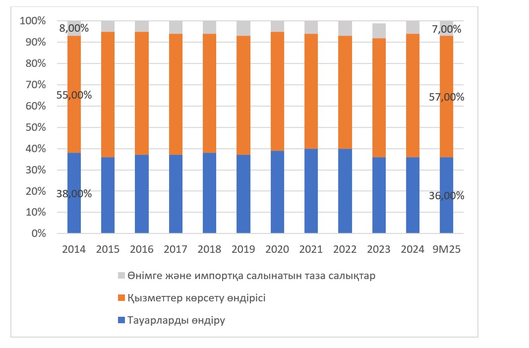Қазақстанның ІЖӨ құрылымының 2014 - 2025 жылдардағы 9 айдағы серпіні,%