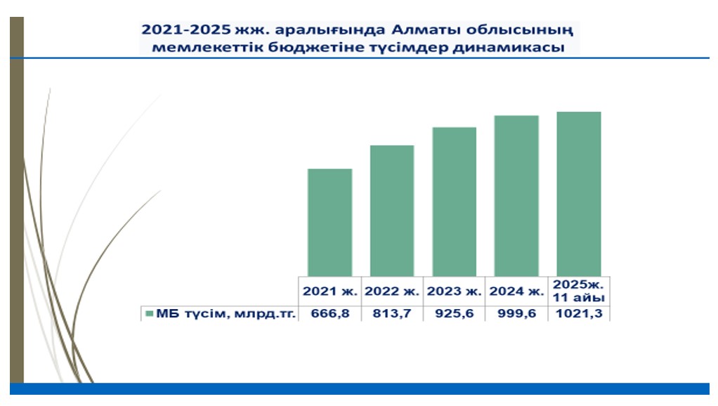 Биыл облыс маңызды белеске жетті: кірістер тарихта алғаш рет бір триллион теңгеден асты. Бұл оқиға өңірдің әлеуметтік-экономикалық дамуындағы елеулі кезең болды және салық салу базасын кеңейту және кәсіпкерлікті қолдау бойынша қабылданған шаралардың тиімділігін растады.