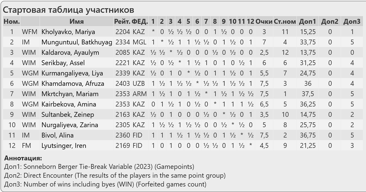 Қалған үштік үшін Зоннеборн–Бергер коэффициентін (SB) есептеуге тура келді: онда сен жеңген қарсыластарыңның ұпайлары мен тең ойнаған қарсыластарыңның жартылай ұпайлары қосылады. Дәл осы көрсеткіш шахматшыларды орын-орнына қойды: Мкртчян – 37,5, Бивол – 36,75 және Хамдамова – 36.
