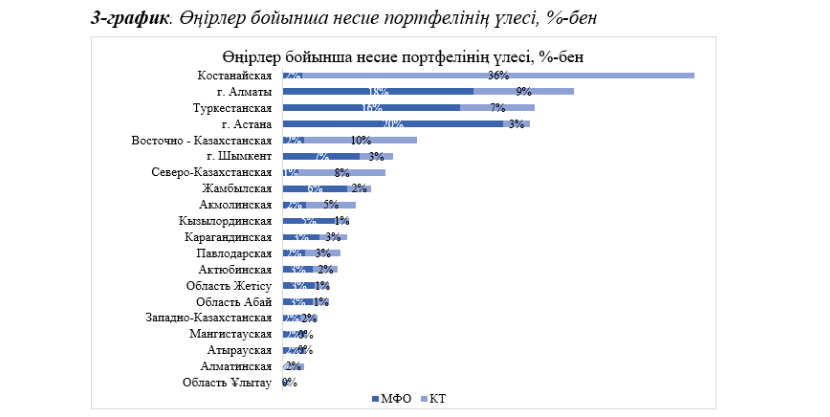Бұдан әрі микрокредиттердің көлемі бойынша негізінен сауда және қызмет көрсету секторларында Алматы (16%), Астана (7%), Шымкент (6%) сияқты ірі қалаларды, Түркістан (10%) және Ақмола (5%) облыстарын бөліп қарауға болады.