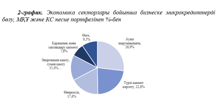 Қолжетімді шарттар беру есебінен МҚҰ мен КС экономиканың қызмет көрсету және электрмен жабдықтау сияқты секторларына микрокредиттер беру мүмкіндігіне ие, олардың үлесіне тиісінше несие портфелінің 22,8% және 15,4%-ы тиесілі.