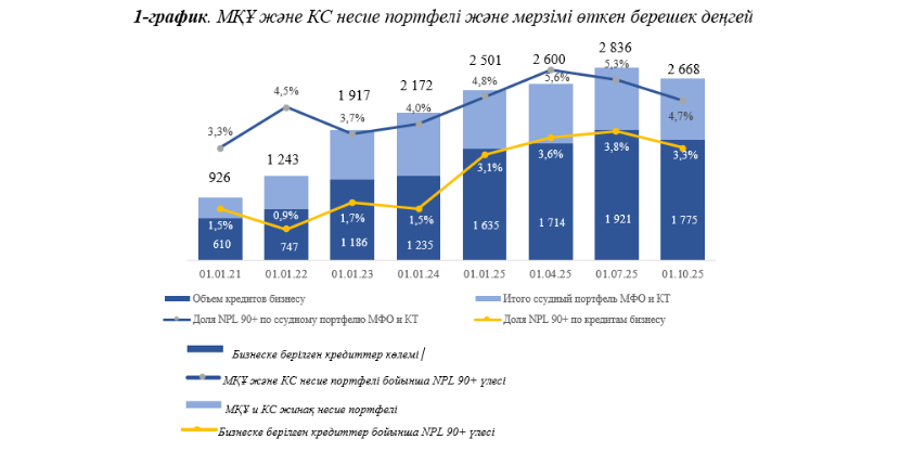 МҚҰ және КС-нің кредиттеу субъектілері экономиканың тәуекелі неғұрлым жоғары салаларында қызметті жүзеге асыратынына қарамастан, 90 күннен астам (NPL 90+) мерзімі өткен берешектің үлесі МҚҰ мен КС несие портфелінде төмен деңгейде қалып отыр. 2021 жылдан бастап барлық несие портфелі бойынша NPL 90+ 1,4 п. т. ұлғайған кезде 01.10.2025ж. NPL 90+ деңгейі 4,7%-ды құрады, ал кәсіпкерлік субъектілеріне микрокредиттер бойынша NPL 90+ 1,7 п.т. ұлғайып, 2,9%-ды құрады.