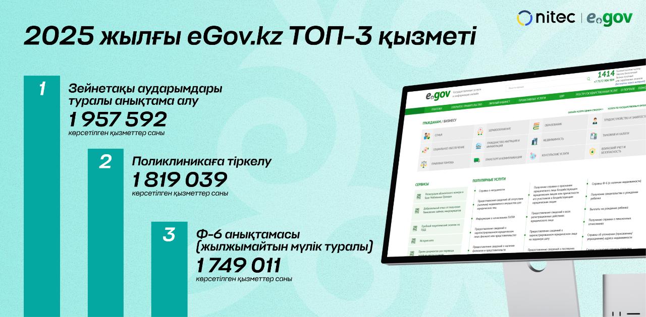 2025 жылы eGov.kz порталы арқылы қазақстандықтар 25,7 млн астам мемлекеттік қызмет алды. Порталдағы ең танымал мемлекеттік қызметтер қатарында: зейнетақы аударымдары туралы анықтама алу, емханаға тіркелу, Ф-6 нысаны (жылжымайтын мүліктің бар-жоғы туралы анықтама) бар.