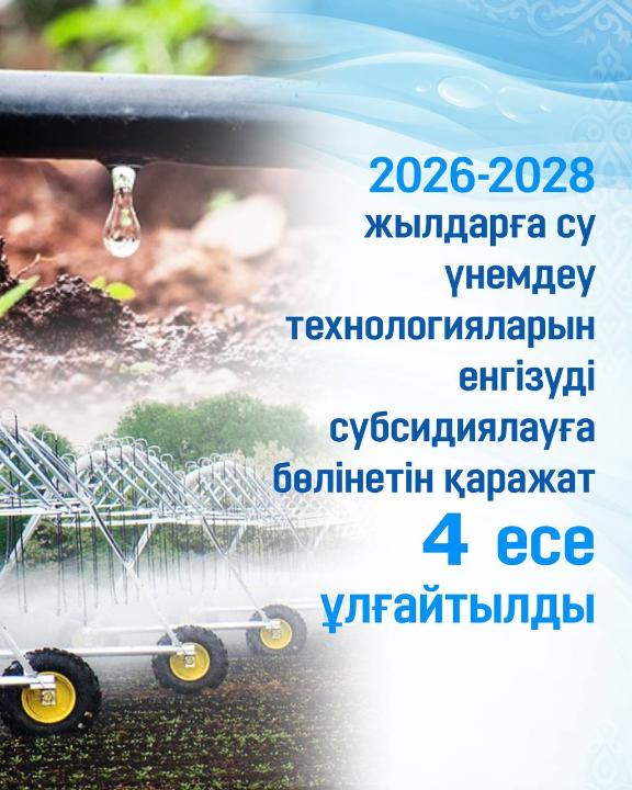 2026-2028 жылдарға су үнемдеу технологияларын енгізуді субсидиялауға бөлінетін қаражат 4 есе ұлғайтылды. Бұл шара шаруаларды заманауи суару жүйелеріне көшуге ынталандыруға бағытталған.