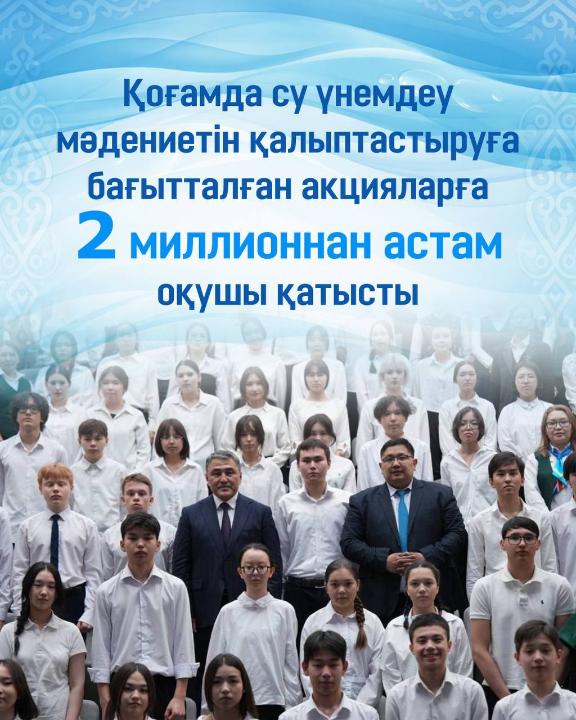 Қоғамда су үнемдеу мәдениетін қалыптастыруға бағытталған акцияларға 2 миллионнан астам оқушы қатысты. Қазақстан бойынша су үнемдеу тақырыбында ашық сабақтар, балалар арасында сурет байқаулары, эко-жарыстар және өзге де іс-шаралар ұйымдастырылды.